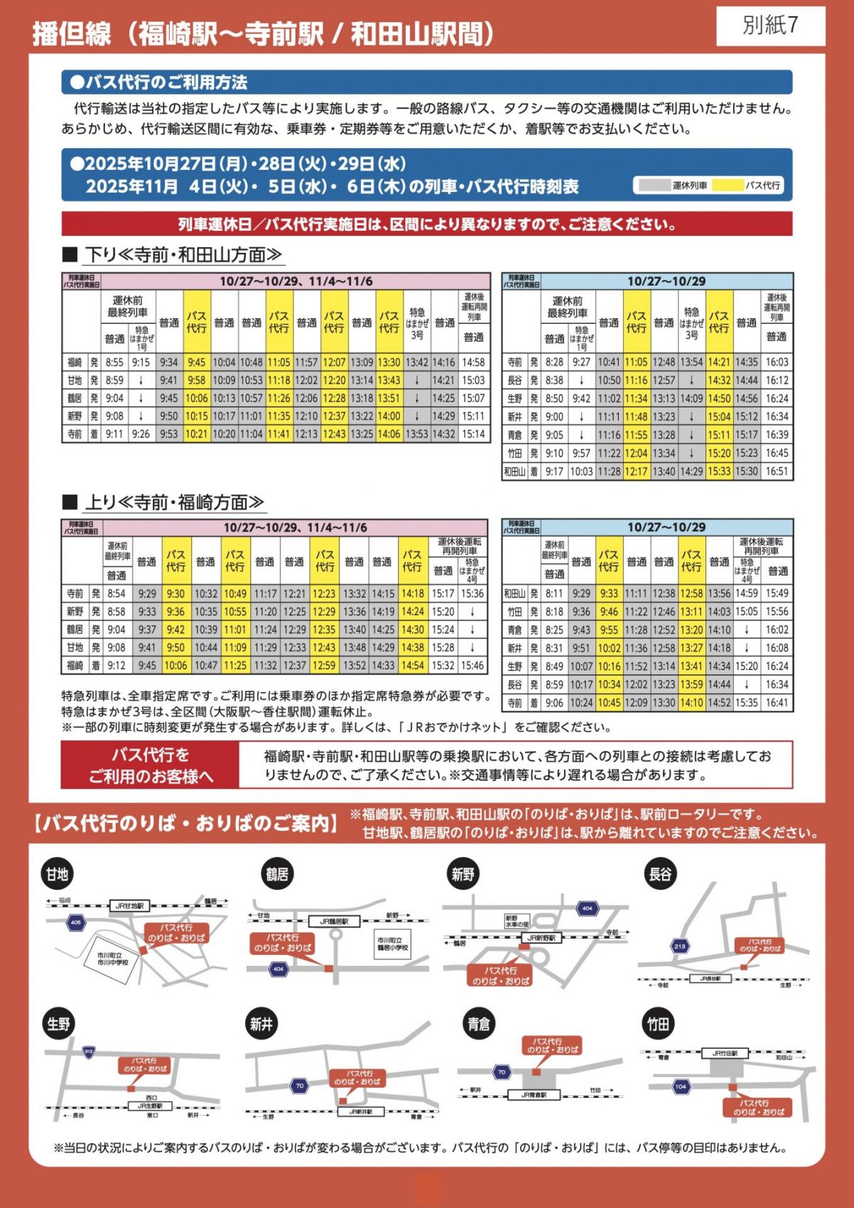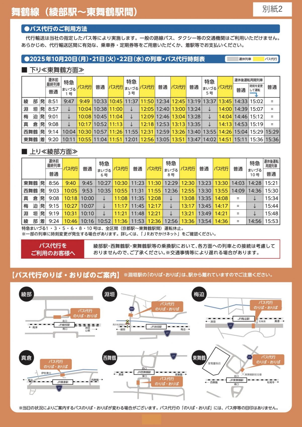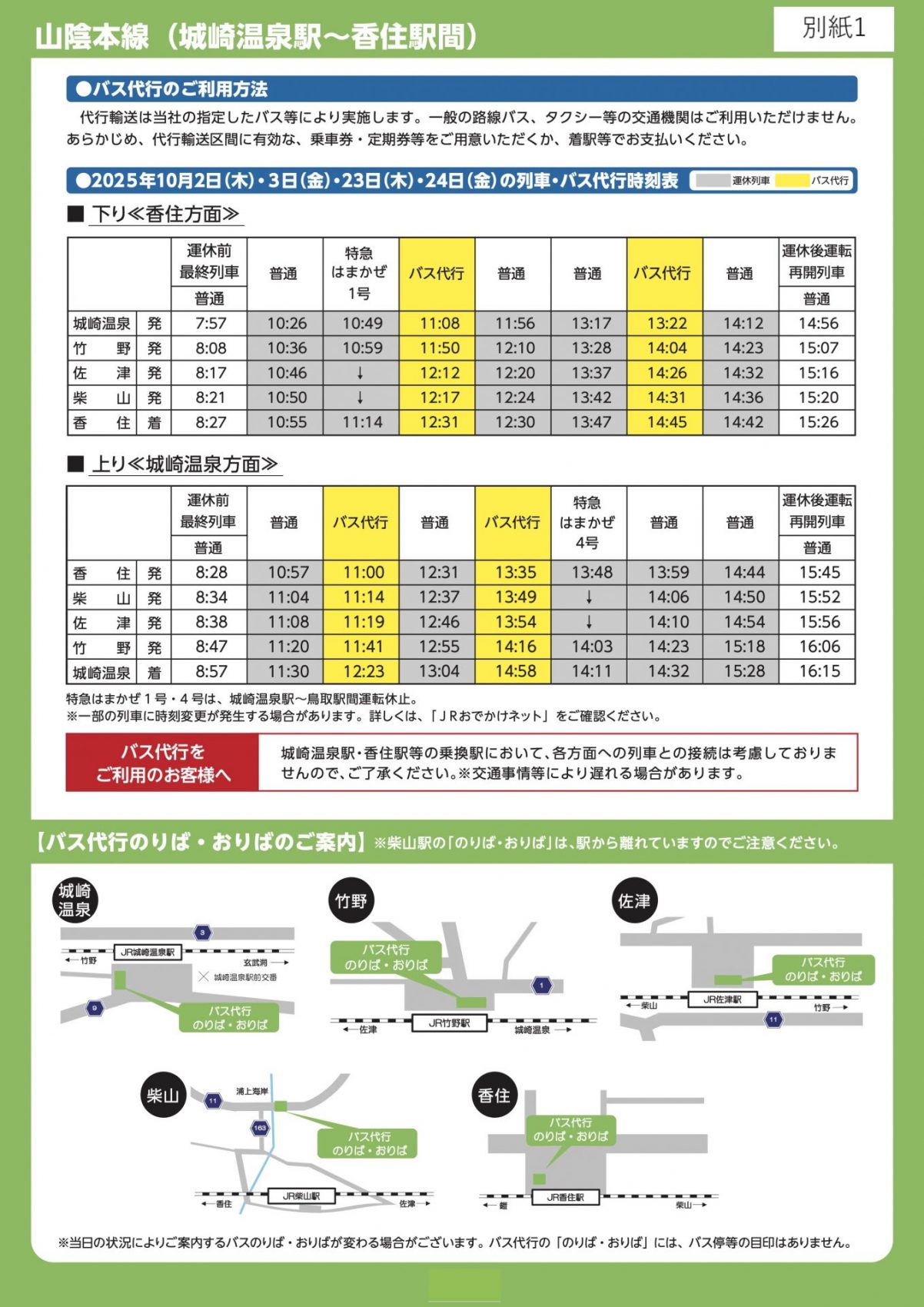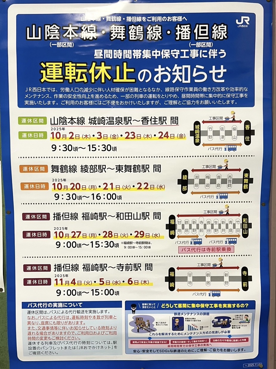 皆さまこんにちは! 山陰本線(城崎温泉駅~香住駅間)、舞鶴線(綾部駅~東舞鶴駅間)、播但線(福崎駅~和田山駅間)(福崎駅~寺前駅間)では、昼間時間帯に集中して保守工事が行われます。これに伴い、両路線では運休が発生し、代行バスの運行となりますので、ご利用の方はご注意ください。 運転休止の詳細 【山陰本線】 実 施 日:2025年10月2(木)、3日(金)、23日(木)、24日(金)の4日間 工事区間:城崎温泉駅~香住駅間 運転休止:9時半頃~15時半頃 ※当ホテル最寄駅の竹野駅が含まれておりますので注意ください 【舞鶴線】 実 施 日:2025年10月20日(月)、21日(火)、22日(水)の3日間 工事区間:綾部駅~東舞鶴駅間 運転休止:9時半頃~16時頃 【播但線】 実 施 日:2025年10月27日(月)、28日(火)、29日(水)の3日間 工事区間:福崎駅~和田山駅間 運転休止:9時頃~15時半頃 【播但線】 実 施 日:2025年11月4日(火)、5日(水)、6日(木)の3日間 工事区間:福崎駅~寺前駅間 運転休止:9時頃~15時頃 ご確認の上、お気をつけてお越しくださいませ😌