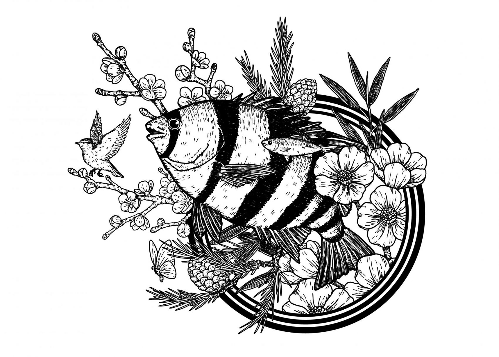 ー デザイナーからのメッセージ ー 「大切なものと、この先へ」 本ロゴは、既存のロゴを発展させ、「創業時から変わらぬ本質を大切に守りながら、新たな未来へ向かって変化・成長していく」という想いを表現しています。 「三方よし」を象徴する三つの輪から、イシダイが力強く飛び出し、さらなる発展へと向かう姿を描きました。周囲には、梅や竹といった縁起の良い植物や、鳥・蝶などの自然のモチーフをあしらい、品のある華やかさを添えています。 これまでの歴史やお客様の声、従業員の皆様の環境、そして地域社会といった「大切なもの」をしっかりと抱えながら、目指す未来へと力強く進んでいく。その想いを込めたデザインです。 atelier MOKU 村山大明(OKUKINOSAKI ART PROJECT - Official Artist#001)